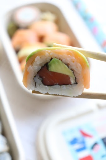 Non Veg California Roll A classic uramaki roll with cucumber, avocado and crab stick at the center, rolled tightly and topped with sesame. The roll is fresh, meaty and light. I always enjoy the crunch of cucumber with the softness of the crab stick and avocado. Dont forget to dip it in wasabi and soy!