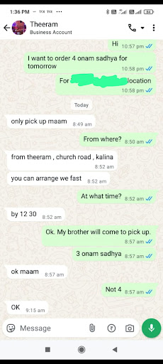 Read moreFor my parents who are 85 plus, I had ordered and paid in advance Rs.1600 plus delivery charges for Onam sadya. The delivery date being 5th,September,2025 and Theeram had promised to deliver on the 5th,September between 12pm and 1230pm. As there was no delivery of the promised food I had called Theeram, I was able to connect after a lot of effort. The lady who answered the phone gave three replies for the 3 times I was able to connect. First time she said the delivery will come soon, the next time she said within 10 minutes and finally she said the Onam sadya was on its way. I need to let one and all know in Theeram this lady lied and lied very well. No Onam sadya was delivered on 5th, September, 2025 and thanks to the wickedness, in sensitivities and cruel mentality of Theeram, my parents went hungry. Had the Theeram management been sensitive to senior citizens with health issues the least they could have done was informed by SMS that there would be no delivery. Had the lady who attended the phone calls spoken the truth then my parents who are 85 plus could have not gone hungry on a festive day. Further more had the Theeram management been more service oriented and ethical in business, they should have refunded Rs. 1600 plus delivery charges by now to all who had to go hungry for no fault of theirs. On 6th, September 2025, Theeram was closed for reasons only known to them. May be they wished that people who had paid and went hungry on 5th, September Onam sadya more agony, suffering and pain. This is third class n third rate torture at its very best. The saddest part being people had paid in advance and went hungry. Can I expect prompt action from the Theeram's top management to refund our advance and delivery charges...