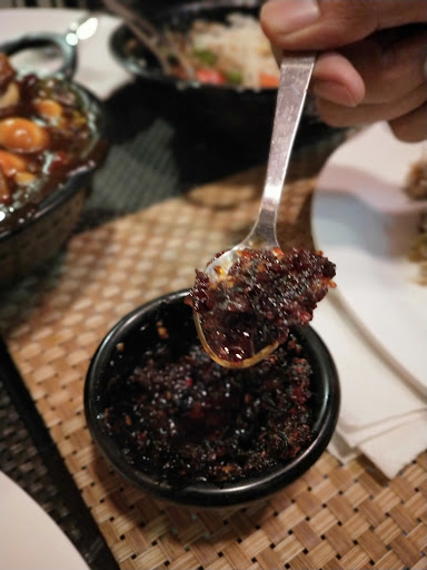 FOOD: Ordered hoksa(pork) curry with bamboo shoots and sticky rice, and Iromba, all recommended by waiter, while pork sausage and pork momos as our choice. Iromba is white chutney which he said is less spicy but also turned out to be very spicy. Pork curry has less gravy and filled most with a lot of oil, we mixed oil and some bamboo shoots with rice to eat as there was negligible gravy. But the Pork was well cooked and tasty👍. Bamboo shoot has a very strong unique smell, many people might not like it, so order accordingly. Pork sausage taste was very unique, don't know to describe it as good or bad, that was spicy too, had many green chilli pieces inside it. Iromba was a like a spicy gravy chutney, can't mix with rice, didn't know what to do with it. Pork momos were the tastiest, one of the best we've eaten😊, especially with that unique chutney, seemed like blend of pan fried onions and some other things, had dark brown colour. Complimented the pork meat so well.