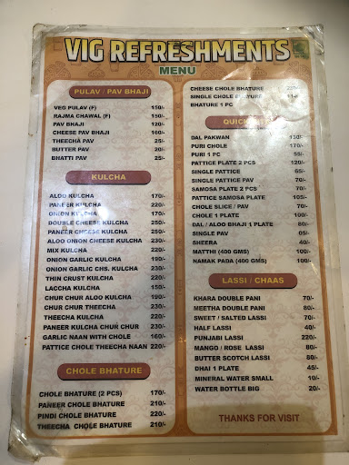 For about close to 5 decades now, Vig Refreshment has been a symbol of Sindhi-Punjabi entrepreneurship and their love for food. If you are very calorie conscious, donât like food kept in the open or a lot of fried / buttered options in your menu then please go elsewhere, this isnât the place for you. But if you do, then dig into the food and relish it with gay abandon and remember to wash your greasy hands with a small piece of Lifebuoy soap under a trickling flow of water.