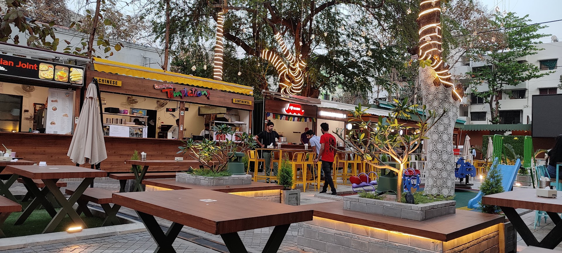Read moreGreat ambience, superb taste and hygiene. This newly opened food court near Mate Square has all the food items that you probably wouldn't have tasted under one roof - Thali, Chinese, Continental, Desserts, Rolls, Momos, South Indian, Tandoor and what not. The place is fully functional post 7 p.m., but you can still visit after 6 p.m. They have ample parking for two wheelers and sufficient for four wheelers, but better to come by two wheelers itself. Separate and clean washrooms are available for both men and women. Even the tables are cleaned sooner that you are done having the meal. The recommended method is to first roam around the place and decide on what you wish to eat. Then you may go to the billing counters (4 in numbers) and tell them the name of the dish and pay. Collect the coupon and be seated at your place. The order is automated towards the respective stall. Just keep an eye on your coupon number being displayed on the stall who's food you have ordered. After the number is displayed, go and fetch the food yourself. Among the must try dishes is the Red chilli noodles, corn cheese...