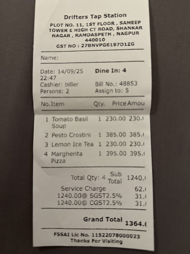 Read moreEdit 1 - Drifters Tap Station is a new addition for all the Tap Beer lovers in Nagpur (the Franchise details have now been updated on the Drifters Tap Station website). Great ambience, great interiors. They have a separate seating for smoking and non-smoking customers. One thing I liked about Drifters Tap is that they provide some tasting samples of their beers, so that customers can judge and decide for themselves. These tasting samples however are limited per table (and not per person). Also they keep running special offers on weekends, or special days, so please check with the staff if you are eligible to avail them. We tried the Belgian Wit, German Lager, Kokum Cider, Irish Red Ale, Vienna Lager and Hefeweizen. The beers were great. Their beer menu tells clearly which beer would feel bitter and has how much alcohol in it, this is something I really liked. I was not happy with the food in particular. We had ordered Stuffed Kulcha Balls (which I thought were way overpriced, 400 rupees for just 4 balls and they didn't taste extraordinary as well). The wood fired pizza was good, but this is served only after 7 pm (so we had to wait for a good 45 mins for it to be served). I believe that people prefer Pizza and Beer, so if you are serving beer from say 6 pm you should serve pizza also at 6 pm. All in all, a good place and definitely...