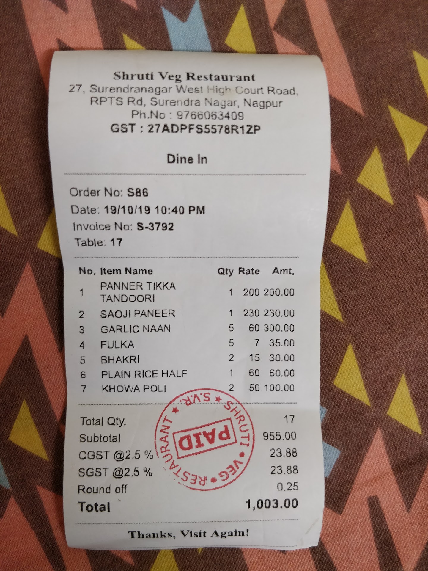 Lastly, the taste was terrible, never had such a terrible mixed veg ever in my life. The chinese items were horrible too. Can't deny the fact that I was expecting Chinese to be good from Shruti. When took all of this to the restaurant owner to raise a complaint, he didn't bat an eye and laughed it off as if it were nothing.