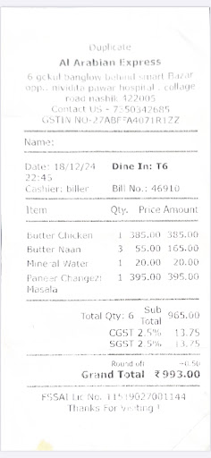 Yesterday we went for dinner at Arabian Express Nashik and the experience was way beyond my imagination (if someone asked me to delete one thing in my life then that would be this one). First, we had to wait for nearly 20 min, which is the least worse part. Then they changed 3 people to take the order. We were 5 vegetarian ppl and 5 non-veg ppl. Vegetarians ordered paneer kabab and it is the worst starter I’ve ever had. Later, we had to wait for nearly 15 mins before the main course. While changing plates for the main course, they did not even clean the table and did not even collect used tissue papers. While serving paneer changezi masala, the waiter literally served half of the dish to a single person only, when we already told him that it is for five people, and while serving veg handi, the waiter did not even mix that dish and 2 of us got only gravy. (They barely have 7 to 8 vegetarian options available and in that too 2-3 options weren’t available it’s a whole other story). Well, we finished 1st round of rotis and ordered for the second round, we literally had to wait for more than 30 mins (in the meantime my friends even went for a walk). After experiencing that, we ordered rice-dal and chapatis for the next round immediately cause we thought at least then we will get the order on time, but of course, they were too busy watching the KKR vs SRS match that I finished one complete unit of my syllabus for my upcoming exams and even then I got some time to shoot a mini vlog. Finally, we received our order of chapatis and then we again had to wait for dal chawal. Well, we thought at least we will get packaged water on time (which of course they already had in the fridge), but I sat 15 mins thirsty after ordering that, and when I asked them about extra lemons, just to surprise me with their extraordinary behaviour, they said they were out of lemons. Later, after some time we got those (it took the least time after the order) maybe they are aware of the concept of Zepto. Well, it was all okay when we understood, they have only a single restroom (just one room for both gents and ladies) and didn’t even serve finger bowls (might be living in 2049 that they did not know about this concept), and you know the best part, the wash basin is literally in front of the entrance, so we had to go straight opposite to our table to wash hands, and we paid 5000 rupees for this exceptional food, extraordinary service, and exuberant ambiance. Though the food was mediocre, we did not even realise that because we were too busy studying, walking, and shooting vlogs...