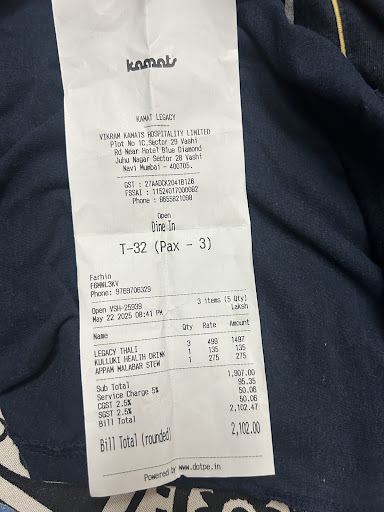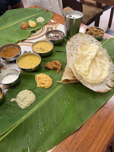 And then the thalis came, and we started eating. My sister started eating from my mother’s thali. Then that waiter girl came and said, “You can’t share a thali.” (My sister and I have visited this restaurant multiple times and have shared a single thali every time we went.) We ordered appam and Malabar curry for her, which they didn’t serve for another 45 minutes. A server came with extra appam instead, which we didn’t ask for, so I thought he misunderstood my previous order to be extra appam and curry (since thalis are unlimited), so I didn’t say anything. We continued eating our food, finished it, washed our hands, and asked for the bill. The girl came with appam and stew. I said we don’t want it and they can cancel it (I didn’t even touch it; the server was carrying it the whole time). We were about to leave, and they said we can’t cancel it. They asked if they could parcel it. I said no. They said it will go to waste. I said, why can’t they serve it to other people? I didn’t want to make a scene in front of my parents—they visit once a year—so I told them they can add it to the bill if they want, but we want to leave. And they did add it to my bill!!!!