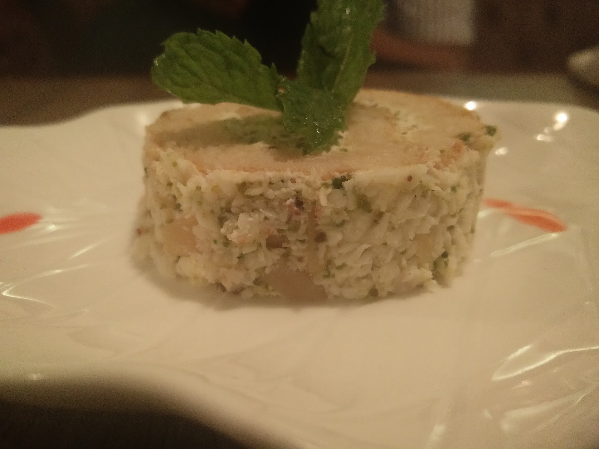 We were welcomed by an amuse bouche (French, translation "mouth amuser") which definitely amused us :P. A bite-size piece of watermelon with a dash of hung curd and a drizzle of soy sauce served on a leaf on a plate over a big bowl oozing dry ice vapours. (Hard to imagine? Check the picture!) The taste was, well, interesting.