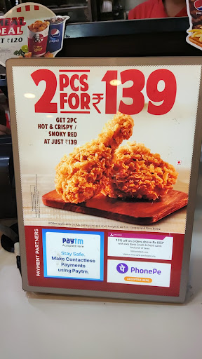 Read moreNice place to spend some time with your family and friends. Best part of this outlet is Most staff are differently able at this outlet which is very nice initiative from KFC to help these people. In private sector most companies do not prefer such people for customer service or at front desk. But at this store they are being preferred which is best part of this outlet. They are giving there best here and handling customers quite nicely. All are very helpful and enjoying there work here. All range of items available here from KFC. Vegetarian and non- vegetarian options are available. You will always get good, hot and fresh food here. As it is in my near by so I visit here very often with family. After a getting tiered of long family shopping at Big Bazar which is also inside the same mall this a nice palace to chill out. Every time I got the same gesture from the staff. At the evening time it gets crowded usually though it's your luck. Nice and big outlet as Almost 50 persons seating capacity is available here. It's very 1st shop near the entrance of the mall and easily accessible n noticable. A common washrum is also available...