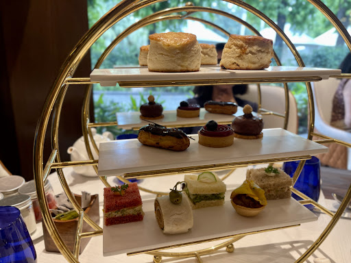 Then we received the three tiers of sandwiches, pastries and scones. The sandwiches were delicate and flavorful: cucumber, chicken and egg. The only disappointment was the salmon wrap, which had a chewy texture that stuck to our teeth. The caramelised onion and goat cheese tart was a delight, though. The pastries (lemon tart, eclair, hazelnut pastry) were all well-made and satisfying.