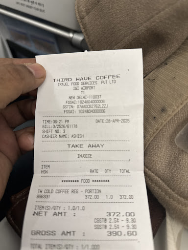 Read moreUnfortunately, I had a very disappointing experience with the black coffee I purchased at Terminal 1 of IGI Airport today outlet Third Wave Coffee. The coffee was completely tasteless and had an unpleasant smell, almost like it was stale or spoiled — reminiscent of bugs, which was extremely off-putting.