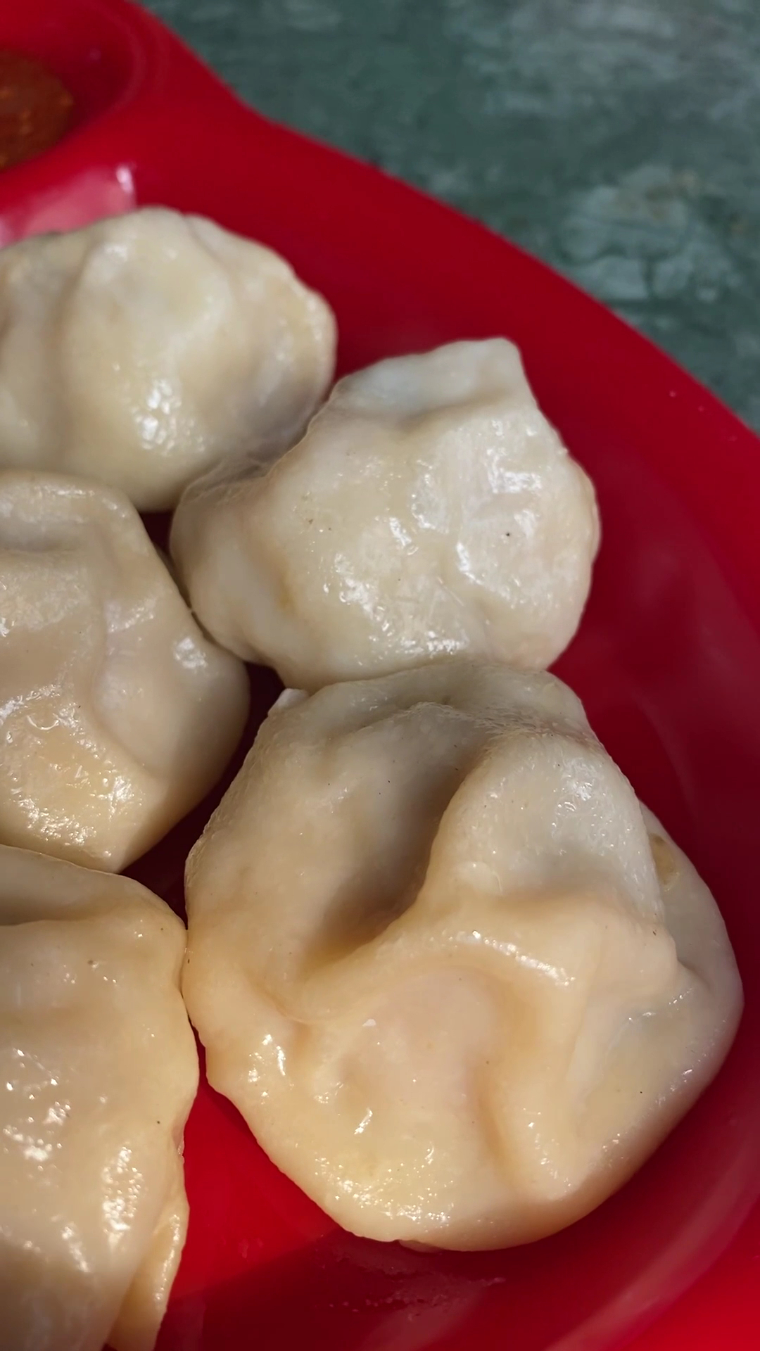 Chicken steamed momos is served with red chunteny which is quite spicy and also with a bowl of clear soup. It is best to dip the momos in the soup and add some chutney before taking a bite.