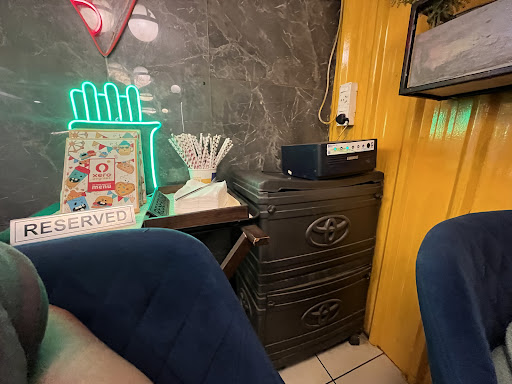 So, the famous pic with neon signs at Xero's? In this outlet? Forget it! The sign is very inconveniently located in a very narrow area, sealed by placing plant pots (see pic)