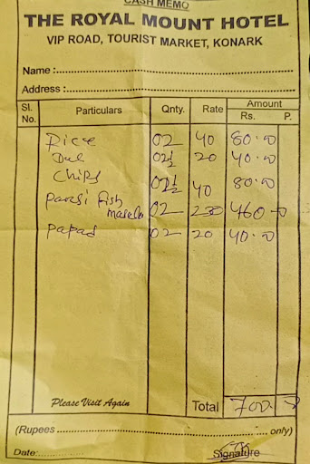 This is an humble request to all of those who are coming to visit konark Sun-temple & decided to take lunch from 'Royal Mount hotel'. Please be very cautious, they set up a fraudulent business strategy with most of all Odissa traveling tour agency. It's an real time exp. to all of us, we are 4 members set up a conduct tour with M/S P.N MUKHERJEE Tour & Travel, when we reached this destination as per their internal set up, they hold we have to take lunch from here, as per reasonable price items will available. Before, going to temple Rs.100 advance taken (out of total value Rs.560) from one of their hotel staff but, when the final bill I paid, it's stating Rs.710. How? I really expect a strict action from these kind of fraudulent act. I request to Oddisa tourism dept. to investigate this issue, other wise they will definitely loose their tourist day by day. Please, take serious action agaist of these...