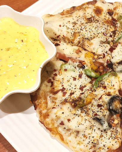 βοΈ Pizza Volcano : A beautiful looking pizza (topped with onion, capsicum, red and yellow ball pepper, olives and cheeeseeee) was served with bowls of creaaamy saucy dip and tomato ketchup tasted perfect! ππ