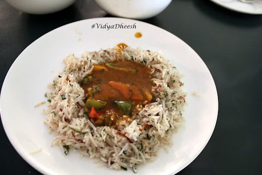 Upon the recommendation, I ordered for a Tagine of Vegetables; a Moroccan specialty. Tagine actually means a clay pot used for cooking in Moroccan kitchens. I was told that the gravy would be a mild spicy with a hint of tanginess and it indeed was. It had bell peppers, mushrooms, French beans, carrots and zucchini; well you can add as many veggies in this dish. The spice was derived from harissa paste, tanginess from lemon juice. It was served with herbed rice topped with crispy fried onions and fresh coriander. The bland flavour of the rice, maybe made so on purpose, complemented the gravy very nicely. RECOMMENDED!