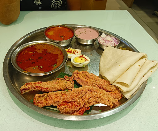 Paired with the thali, the Tambra Pandra Rassa is a revelation. This signature Kolhapuri gravy, known for its deep spice blend, is amazingly authentic, transporting your taste buds straight to Kolhapur itself! Even better, refills on the rassa are unlimited, perfect for those who love the heat.