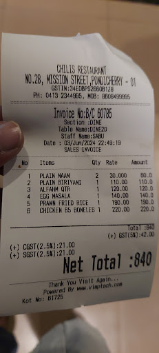 Read moreOrdered Tandoori Chicken, Barbeque Pepper Chicken, Chicken Fried Rice, Cheese Naan and Fresh Lime juice (ordered a soda but got a juice). All the dishes were good and yummy except the issue with Barbeque Pepper Chicken. The taste of the BBQ was actually good and it was really juicy and tender as well. But, the issue was that one of the pieces was undercooked and could see the blood stains from one side of it. On informing the manager, he politely apologised and suggested a replacement. But, we were already full by then and I politely rejected the offer with a feedback. He also discounted Fifty bucks from the total bill, without even asking. Kind & responsible gesture IMO. Naan and Tandoori were fabulous together and their Mayonnaise was awesome too. Ambience was not that great but has nice air conditioning. Staff was helpful and courteous. Overall: Would definitely visit again and not hope for such issues again. Reduced a star for the undercooked thing only. PS: Forgot to click pics of this place as was too famished...