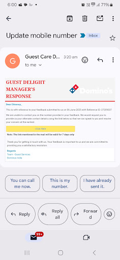 I raised multiple complaints with Domino’s customer service over the following days. Every time, I was told that the "concerned department" would get back to me within 24 hours — but most of the time, no one ever did. Eventually, when I did get through, I was told the issue would be taken up with the local store, but no real action followed.
