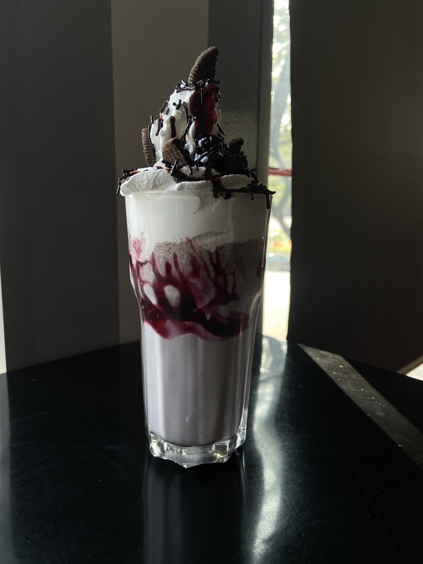 Blueberry Cookie Shake ā Whether you are satiating your sweet tooth or want to have a feel good think shake at any time of the day, this Blueberry thick shake will satisfy your desire. This rich, crunchy, chocolatey, sweet goodness can be finished in no time. The blueberry shake is topped with whipped cream and everyoneās favourite Oreo cookies.