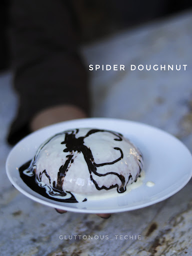 Spider donout : plain dounut infused with melted dark chocolate n dipped in white chocolate. Wht else do we need. A spectacular combo for...
