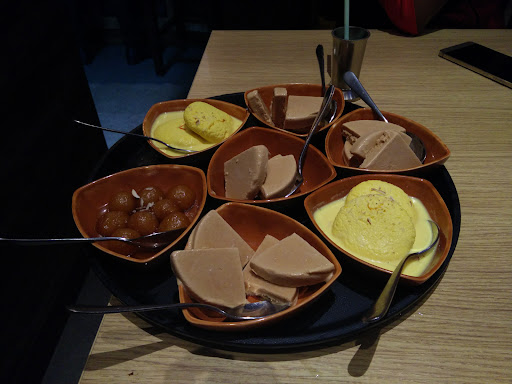 I went to this place on Friday evening for a team dinner. 12 of us were greeted nicely at the front door and taken to a place. The restaurant is very nicely decorated inside. The brick wall, the hanging bronze bells, wooden furniture with bright colored fabrics, big ceiling lights and nice soft music making Copper Chimney a good sit out dining place in Viman Nagar area. Though I found the staff rather absent when we needed them or sometimes interrupting during our chit chats. The manager treated us nice surprisingly and gave us 15% corporate discount for some reason. Well the food, OH YEAH!, is good as well as are the Mocktails. Even though I found the Veg Menu containing less offerings in general the quality of food is good. We ordered for starters Copper Kadak Roomali, Chilli Cheese Naans, Bhuna Lasooni Paneer, Paneer Tikka, Achari Mushroom. The Copper Kadak Roomali comes with chopped tomato and onions marinated with butter, salt and chilli masala, making it very irresistible. Quality of Paneer used in Paneer starters was creamy and soft. Paneer Tikka had a very nice blend of spices while Lasooni Paneer was not very impressive since it lacked that lehsun (garlic) flavor. Achari Mushroom’s mushroom quality was good and it was nicely blended and grilled. Good Quality comes at the cost of Quantity, therefore, quantity of Paneer and Mushrooms in starters is very limited. Along with this we ordered Mocktails such as Virgin Mojito, Khatta Jaljeera, Rusleela, Shikanji, and Lassi and Beverages such as Fresh Lime Soda. Virgin Mojito gave a nice punch of soda and lime and is definitely worth a try. I had a lot of expectations from Khatta Jaljeera since the drink looks amazing on the menu. Well it certainly meets the expectations despite lacking the soda punch one expects from any jaljeera drink. Lassi, Fresh Lime Soda, Rusleela and Shikanji are also worth a try. For main course, we ordered Corn Palak and Amritsari Chowk Ke Chole along with Whole Wheat Roomali Roti, Cheese and Garlic Naan and Garlic Naan. Corn Palak was nice and palak (spinach) was not bitter at all. This dish goes well with Whole Wheat Roomali Roti or Naan. Amritsari Chowk ke Chole is served in a Bronze 3-piece tiffin box. It comes along with 2 stuffed aalo (potato) Kulcha in one box and finely chopped tomato and onion salad in another box. Chole tastes very authentic and melts right into the mouth. The ginger and masala makes this dish very palatable. Finally, we ordered Kulfi, Rasmalai and Gulab Jamun for Dessert. They have a total of 5 desserts and sadly only 3 were available for us to order. The taste of all the dessert was good. Final Verdict, the quality of food is nice and along with nice ambience this place is worth the money. So when you are in Viman Nagar must consider Copper Chimney in your to go list. I would like to rate this restaurant as following: Ambience ** Food...