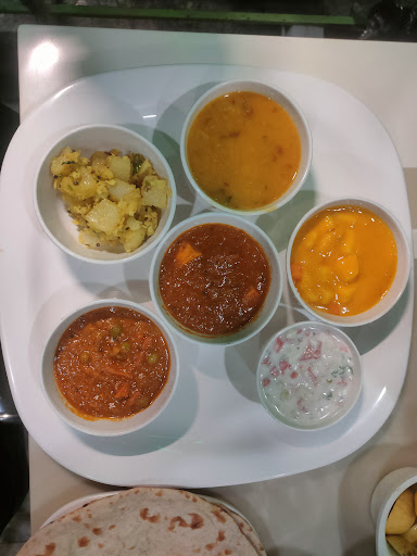 Read moreI visited this restaurant during lunch time so ordered a deluxe thali for Rs. 220. It is a limited thali and can be shared with another person. Comes with the option of roti or chapati. The seating arrangement is comfy and the waiter immediately showed me the path to the washrooms which are maintained well. 3 fresh chapatis, raita, papad and curd milk and a gulab jamun. The potato sabzee i The highlight was the taste of the all the three sabzees & raita given. (mutter masala, paneer, moong daal ) You have an option to order plain rice or pulaav or just add more chappatis instead of the rice dish. Cleans spoons and forks were available and sufficient supply of fresh cut onions, lemon and pickles. Although, the pickles were too salty.
