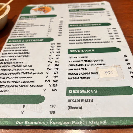 We ordered the Ghee Pudi Tatte Idli and the Ghee Pudi Masala Dosa. The food was simply yummilicious! The Tatte Idli was incredibly soft, melt-in-your-mouth perfect, and the fragrance of the ghee and pudi blend was divine. The Masala Dosa was crisp, expertly prepared, and the accompanying chutneys were fresh and flavorful—easily some of the best South Indian fare we've had in Pune.
