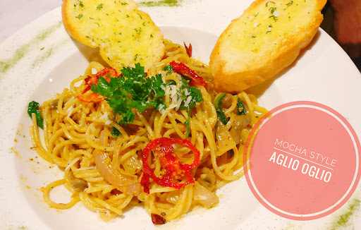 Mains: Mocha style Aglio Oglio: spaghetti Pasta served with nice 2 big garlic bread. Good portion size. Perfect combination of herbs and right mix of olive oil made this paste perfect. #MustHave I missed out the Thai green curry and rice... Which will be covered in next visit!!