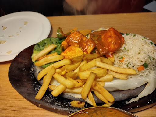 The paneer was well cooked and good and served with rice, fried veggies, french fries and Capsicum with mashed onions. The fried veggies were not cooked properly, the capscum was raw, we could not eat it. IT looked like it was made in a hurry.