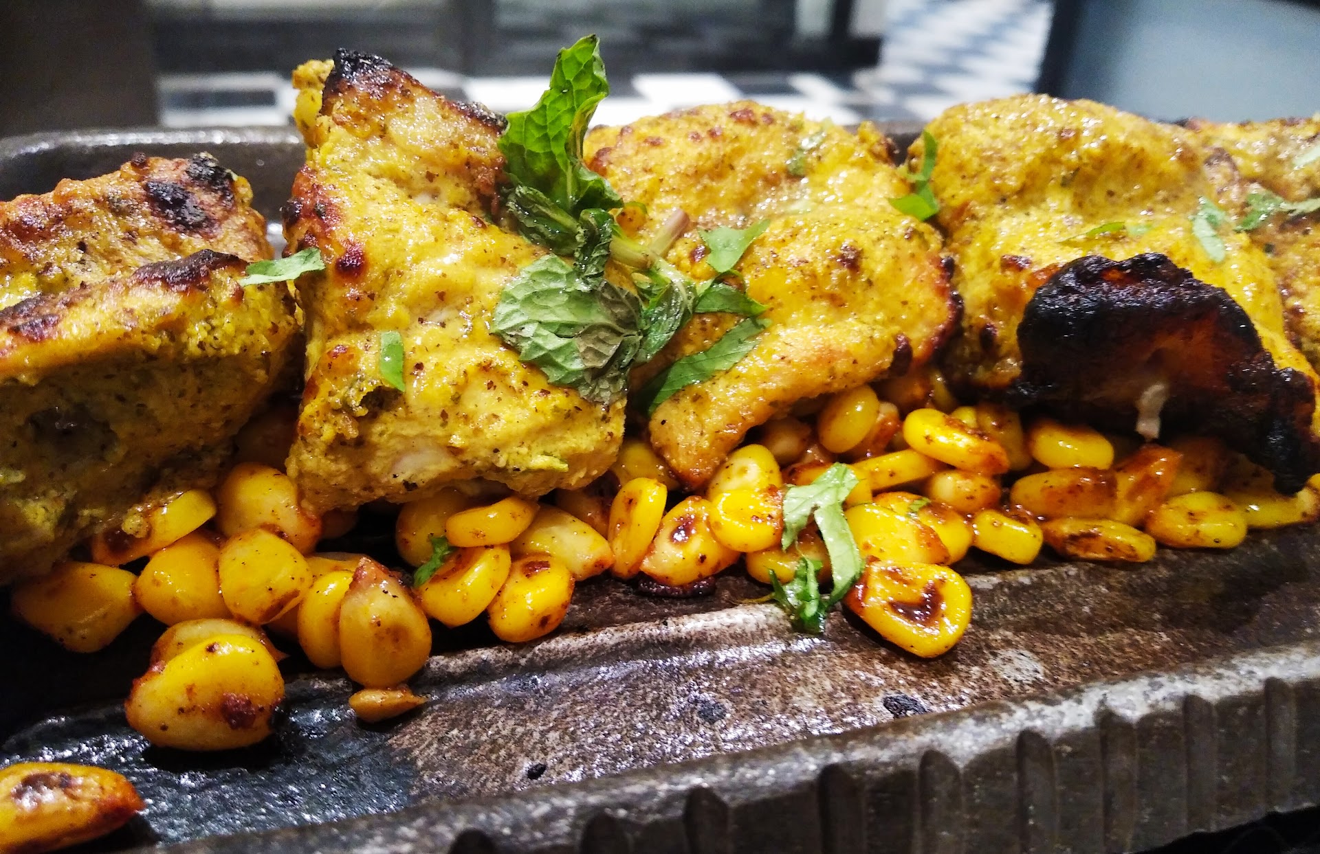 Lahori murg tikka - the succulent and well marinated tandoori murg tikka served on a hot griddle and over a bed of spiced/masala boiled sweet corn kernels.
