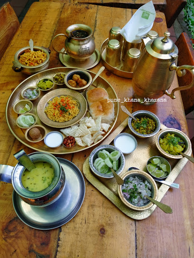 Misal pav is a popular Mumbai street food of usal (sprouts curry) topped with onions, tomatoes, farsan (fried savory mixture), lemon juice and served with pav. It can be served for breakfast or as a snack which can be easily extended for lunch and dinner too. You will get here special Shrimant Misal Thali and Special Jain misal thali unlimited and in affordable price. 1. Special Shrimant Misal: It was spicy and lip-smacking dish. Its taste was unique. It had tangy tomotes and pungent onions with spice powder.This dish was served in a golden thali which makes us feel special. A salad consisting of onions and lemon is served on the side which appeases our taste buds. It is pocket friendly and it is unlimited. 2. Shabudana Khichadi: It was usually flavored with peanuts,chilies, cumin and curry leaves. khichdi was extremely simple and yet so flavorful. I love this sabudana khichdi. They served this with yogurt on the side and with there special peanut ladoo. 3. Thalipeeth: It was generally savoury in taste. It had addition of spices like coriander, cumin and onion. Thalipeeth was generally served with plain yogurt/curd with either fresh butter and pickle as a side dish. It taste was awesome. 4. Buttermilk: It had a sour and tangy taste. It was thick liquid with addition flavoring and thickening agents. It was really refreshing and better for digestion. 5. Aam Panah: It is a very refreshing drink made using Raw mangoes, fresh mint, sugar, salt and roasted cumin powder.It was delightful and natural coolant. Their hygiene is highly commendable along with their staff and the staff is very friendly and helpful. Overall great Experience and totally loved this place 💗 Follow us on Instagram @pune_khana_khazana #pune_khana_khazana