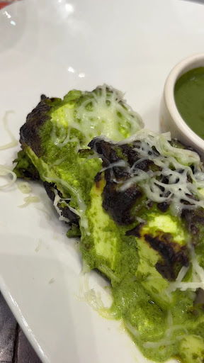Pahadi paneer tikka: Well marinated paneer with green masala charred nicely in the tandoor served with the tastiest green chutney and masala onions.