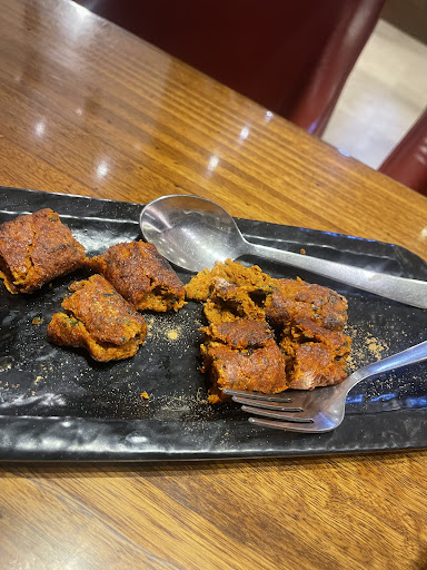 (c) Starters: We ordered our favourite spinach rolls along with chicken malai tikka for starters.The spinach roll was scrumptious which was relished along with the minty pudina chutney and onions. The malai tikka was served steaming hot and was juicy, it had the right composition of flavour that made it melt in our mouth.