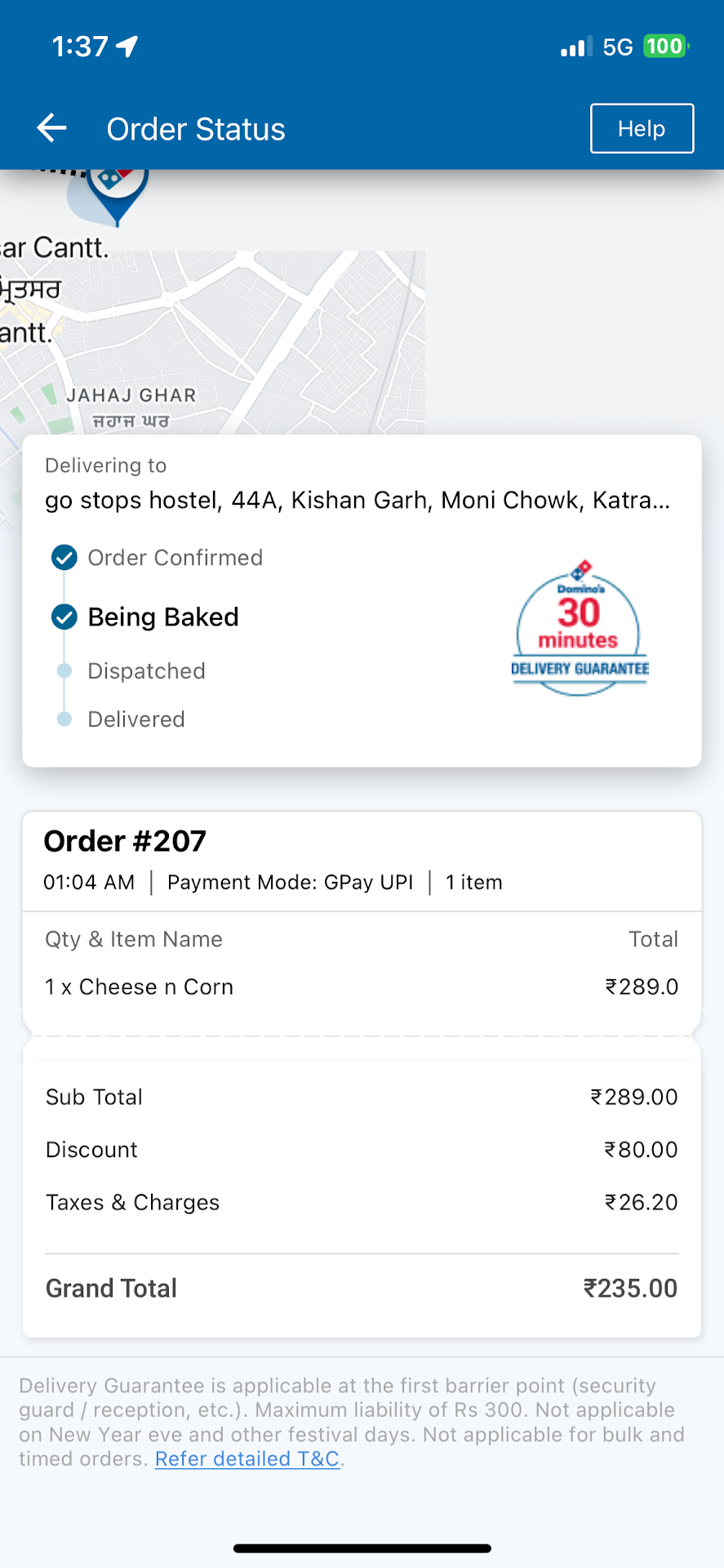 As you can see in picture. I ordered a pan pizza at 1:04 am from this dominos outlet. And delivery partner was still at outlet at 2:05 am. Even after an hour. The number they provided to contact delivery partner was totally wrong. And at last when they order pizza after 1hr 15 mins. They sent me a wrong and cold pizza. As i ordered pan pizza and they sent me hand tossed one. When i refused to take pizza as it was cold and wrong and asked for refund to there manager on call, He offered me refund in form of domino's coins, which i accepted but then in the morning they refused to do that. Now there manager isn't picking up my calls. So pathetic service and shame on your hospitality guys..