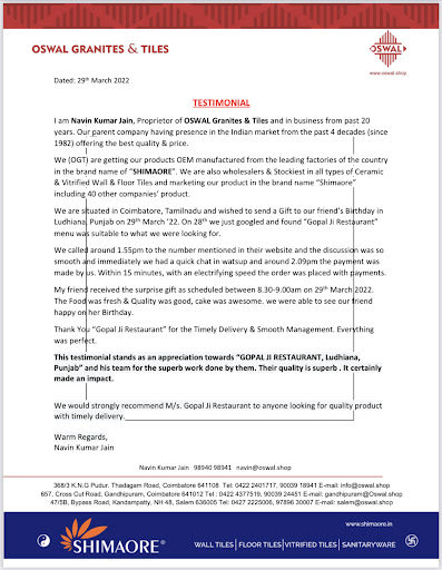 Testimonial to M/s. Gopal Ji Restaurant, Ludhiana