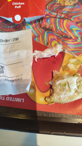 The food was absolutely disgusting. The bun was torn apart as if someone has taken a bite before delivering. The tikki inside is not burnt but raw. The McPuff are raw. Raw sauce inside with no veggies at all. The fries are raw. There is nothing in fries like fried. Not only hard but also dificult to chew at all.