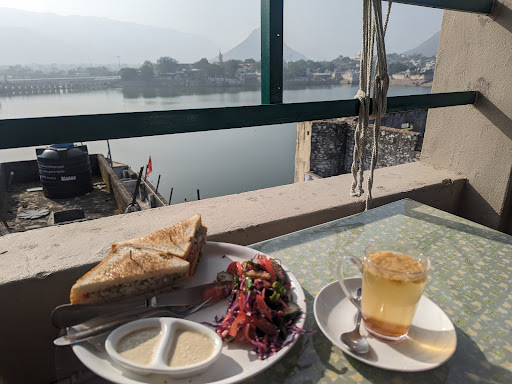 ⭐️ A super spot in Pushkar!! One of my favourites! A really nice view of the lake and super friendly staff! I’ve been multiple times and gotten to know them which is really nice :) They have lots of seating, table and chairs as well as comfortable floor seating. It has fans and a blower to keep you cooler in the summer days. Great views of Pushkar lake, old Rangji temple and Gayatri temple.