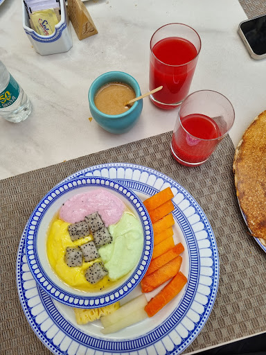 I had a traditional pancake like with potato mash and onions. It was served with 3 diffent curry sauces. Fresh of watermelon and masala tea. 3 types of fruit yogurt and papaya.