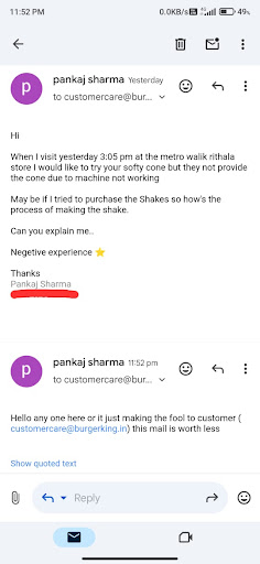 Read moreStaff is not aware what is the process of handling the situation. I have redeemed 1000 points but I didn't get my order done with that. I ask the staff to help me to sort it but they also not aware about the same. Even my points has been cut from the app but didn't get anything for that. @burger_king I think it was my visit at you. it's not about 1000 points it's about when you didn't get the solution for your issue there only. and at the end, staff left me without getting me satisfied. I know this will not affect anything. and owner will attach the apologize msg in reply with customer care email ID, which companies like this does with...