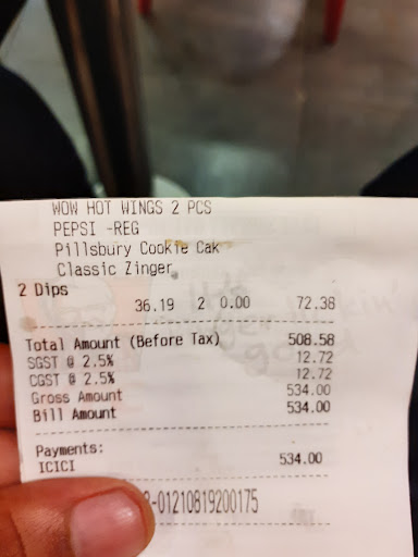 Ā Ā Ā Read moreThe food was HORRIBLE!!!!! WE WOULD NOT SUGGEST THIS PLACE TO ANYONE. DONT EAT HERE AS YOU CAN GET FOOD POISONING THEY JUST GIVE US FOOD WITHOUT LOOKING AT IT .Weordered CHICKEN POPCORN RICE and they served us the RICE WITH NO CHICKEN and COLD RICE , we ordered the TANDOORI CHICKEN ZINGER and the bun was MOLDY, I would have gotten FOOD POISONING if we hadn't seen that We also ordered NORMAL CHICKEN ZINGER and the CHICKEN WAS RAW FROM SOME PARTS. They didn't tell us that the MAYO WAS EXTRA AND NOT FREE , THEY JUST ASKED TO GIVE THE MAYO WITH THE SAUCE. They charged for 4 CUPS of mayo with had VERY LITTLE IN IT but They gave us ONLY 3...