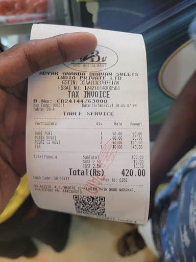 By the way I am from tamilnadu and really love eating some of the dishes like Poori or Dosa. I felt really bad about the service from this outlet since I had the best experience in almost all other outlets(except for shoolagiri – it depends on luck/crowd there). I am only sharing this review because of my love for food and expecting the restaurant service perons to treat at least other customers better. Attaching the bills...