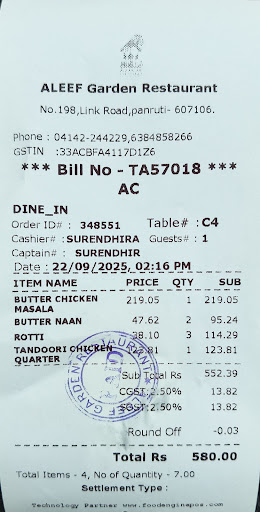 We visited this restaurant with family and kids for dinner. The ambience was fantastic with options for garden, roof and indoor dining. It was well maintained and has an open kitchen. In my view, an open kitchen needs commitment to clean maintenance, so I highly appreciate that. The food we ordered were all good. Fish finger, Chicken lollipop and parotta items - bun and elai parotta all tasted very well. They didn't have regular biryani for dinner, but had aleef spl mutton biryani which has some premium additions over their biryani. That was very good too. We also ordered tandoori chicken. I thought it was a bit dry and could be juicier. And personally didn't prefer chaat masala which they add by default. I suggest it could be left for consumers' choice. The prices were very nominal compared to tier 1,2 cities. I wish them good success for...