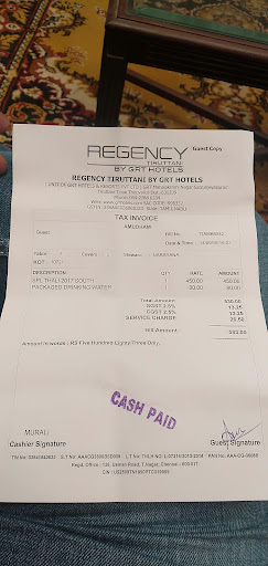 Restaurant is located within Hotel Regency. Vegetarian dining is arranged separately. Located opposite to GRT engineering college; outskirts hence accessible only through car/ bike. Diff veg options like Alpenne pasta, Tandoori items are available. Commendable cleanliness, respectable from waiters/ Watchmen. Food quality is decent enough. Offered soup & pappadams for all guests as food preparation took a long time.