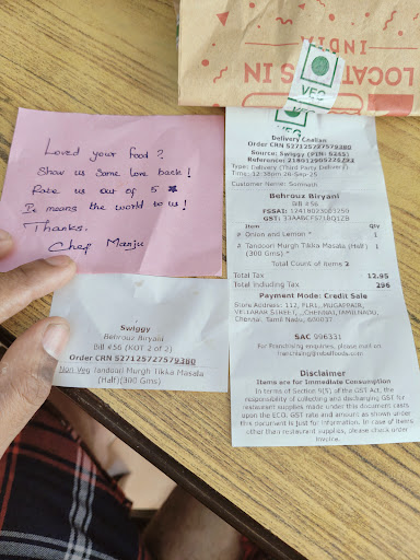 Read moreThey are very conscious about our health. A big one star for that because they send vegetarian food instead of the ordered non vegetarian food and show us their love. And they are extremely careful in packing and labelling the delivered food. They pack the vegetarian food with a green veg label and stick the actually ordered non vegetarian bill over it. And the cherry on top was the chef asking for a 5 star rating by sending a personal handwritten note with the order! Well done guys and keep making everyone's Sunday special...