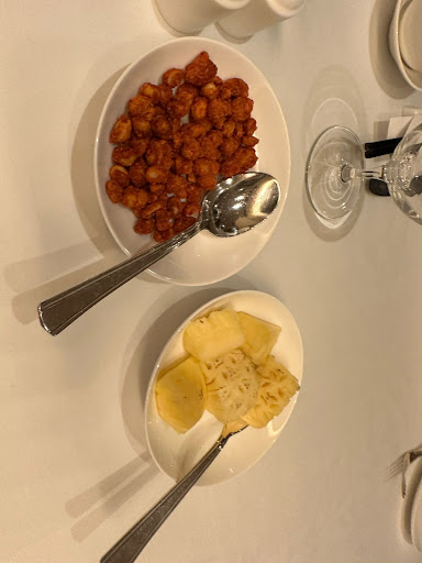 When we first walked in, we were led to our table and given starters, the peanuts and kimchi pineapple.