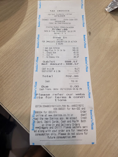 Read moreIn dining horrible experience- Food was average - was almost cold . They never label boxes on preparation , so open it hundred times before delivery to find out what’s what ? And everything turns cold … no proper customer executives to take orders .. people in the kitchen or delivery care not to take orders saying it will take longer and even if customer is okay to wait —- it was Friday eve and just 9pm - they refused new orders and behaving rudely at walk in customers … my dine in order nearly took 45 mins to deliver and half cold with my garlic bread missing and had to be fought to be made quick .. pathetic ambience - cramped up - the upstairs are closed and lights off even if ground floor is full and too loud to make their life easier , service - I would give negative remarks .. if u guys wanna focus only on delivery do close dining experience.. cus v don’t walk in to get cold pizza and pay...