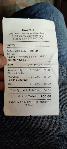 Read moreHad dinner at Gowra's idli and coffee shop in RS puram yesterday after seeing few +ve posts in CFG... Only limited items , just idli,kesari ,Rasa vadai and kichadi which had only coconut chutney as a side dish and they said it's Bangalorian style.. idlis were soft and chutney is ok .... We can't compare with any Bangalore hotel taste .. it's very normal ... They charged Rs.35 (half a spoon of butter added) ... I felt it's over priced as no other side dishes provided ... All leading shops with many dishes like sambar , Tomota chutney they are charging still less... Not understanding the reason for this 35rs ... They could increase one more idli for this price... Also the kichadi is prepared in electric stove for several times based on the orders ... Taking time and also the taste is dynamic in this case, idli tray is not enough to manage more inflow crowd ,they need to consider all these and try to improve for long...