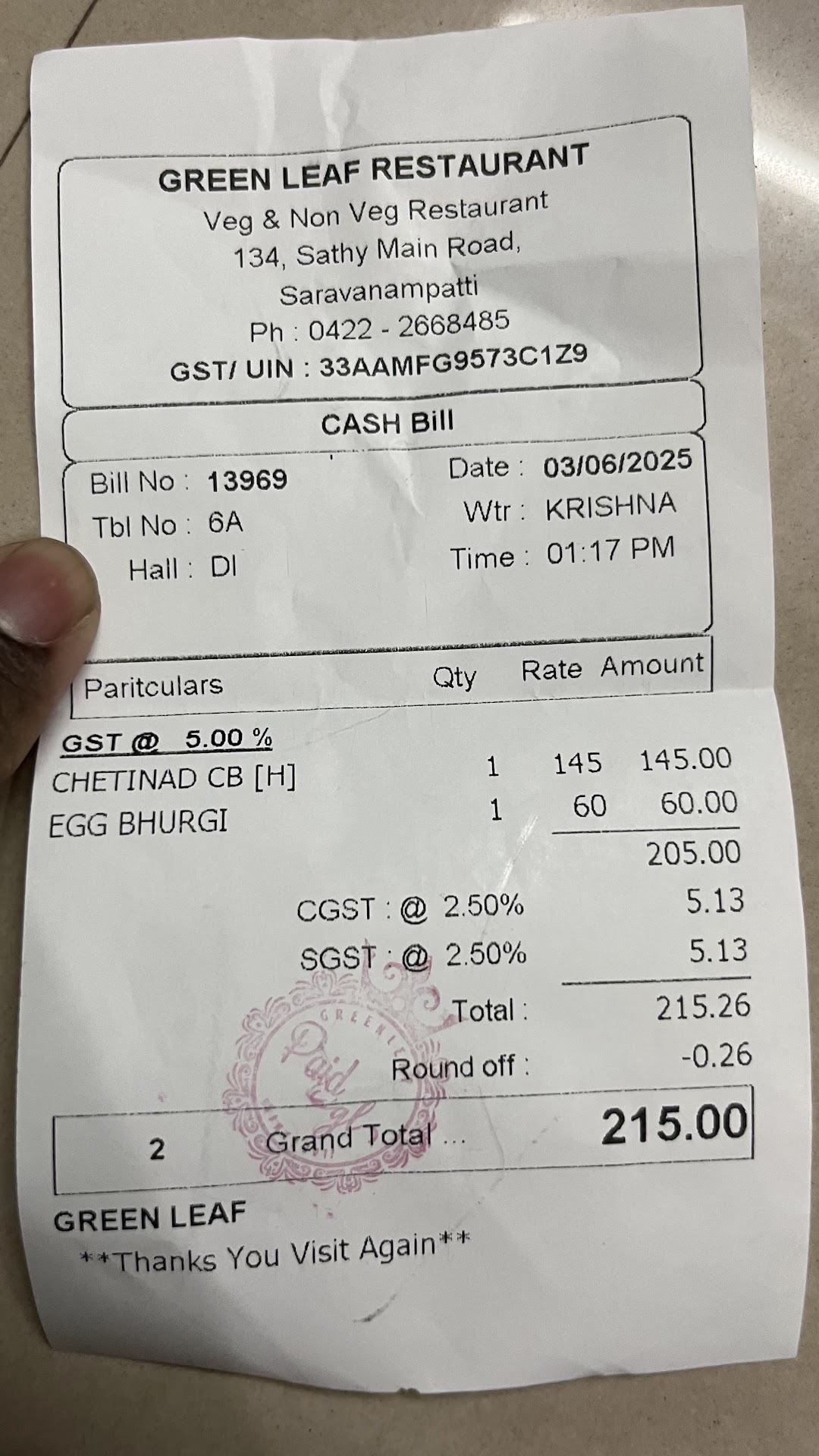Ā Ā Ā Read moreGreen Leaf Saravanampatti is an absolute treat for anyone who loves authentic South Indian vegetarian food. The place is clean, spacious, and has a calm, family-friendly atmosphere. The moment you walk in, you're greeted with a warm smile and quick service.