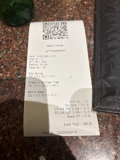 I recently dinned at Grill House, Dr. Thirumoorthy street, Chennai, and had a very disappointing experience. I received the wrong order, and what was delivered was completely different from what I had requested. I had specifically ordered Grill Single fish with Bone Fish, but instead received sliced fish with no bones, which was not only incorrect but also something I did not enjoy last time as they did the same mistake.