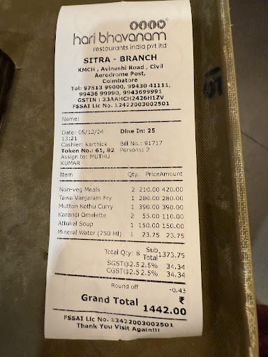 Spending ₹1442 for two people for this level of quality is unacceptable. Hari Bhavanam has always been known for its value for money and consistent taste, but sadly, they seem to have lost both. I sincerely hope the management takes note and works towards improving both the food quality and ensuring the pricing matches the value delivered. Otherwise, long-time patrons like me...