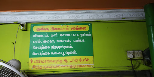 Healthy what? You can choose between Kai Kuthal Arisi, Sivappu Airsi and Normal Arisi for lunch. A variety of millet (Siru Thaniyam) dishes for breakfast and dinner, No Chillis used, Only Pepper, Less oil. For instance, Pappads are fried on fire and not in oil, Less spices, No additives, No white sugar. Only karumbu sarkarai/vellam are used. No milk products. Even the butter milk served is prepared from soya milk and lemon, Vazhai Poo Vadai, Vaazhai Pazha Paayaasam.